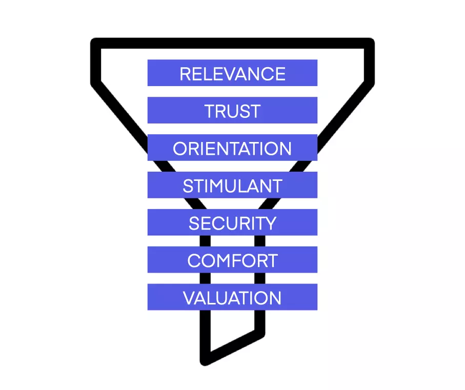 The 7-level model comes from conversion expert André Morys, author and founder and CEO of konversionsKRAFT (Web Arts AG) - Germany's leading consulting firm for conversion optimization. The model describes users' thought and decision-making processes and puts them in chronological order. Only those who are convinced at the first level reach the next stage of the conversion funnel, and only users who are convinced across all levels ultimately convert to paying customers.